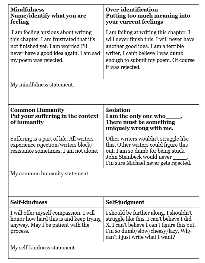 Ex: I am feeling anxious right now because I haven’t heard back about my submission. (mindfulness) It’s okay that I feel this way. All writers feel nervous about how their words will be received. (common humanity) I will honor how hard this is and the bravery it took to put myself out there. (self-kindness)